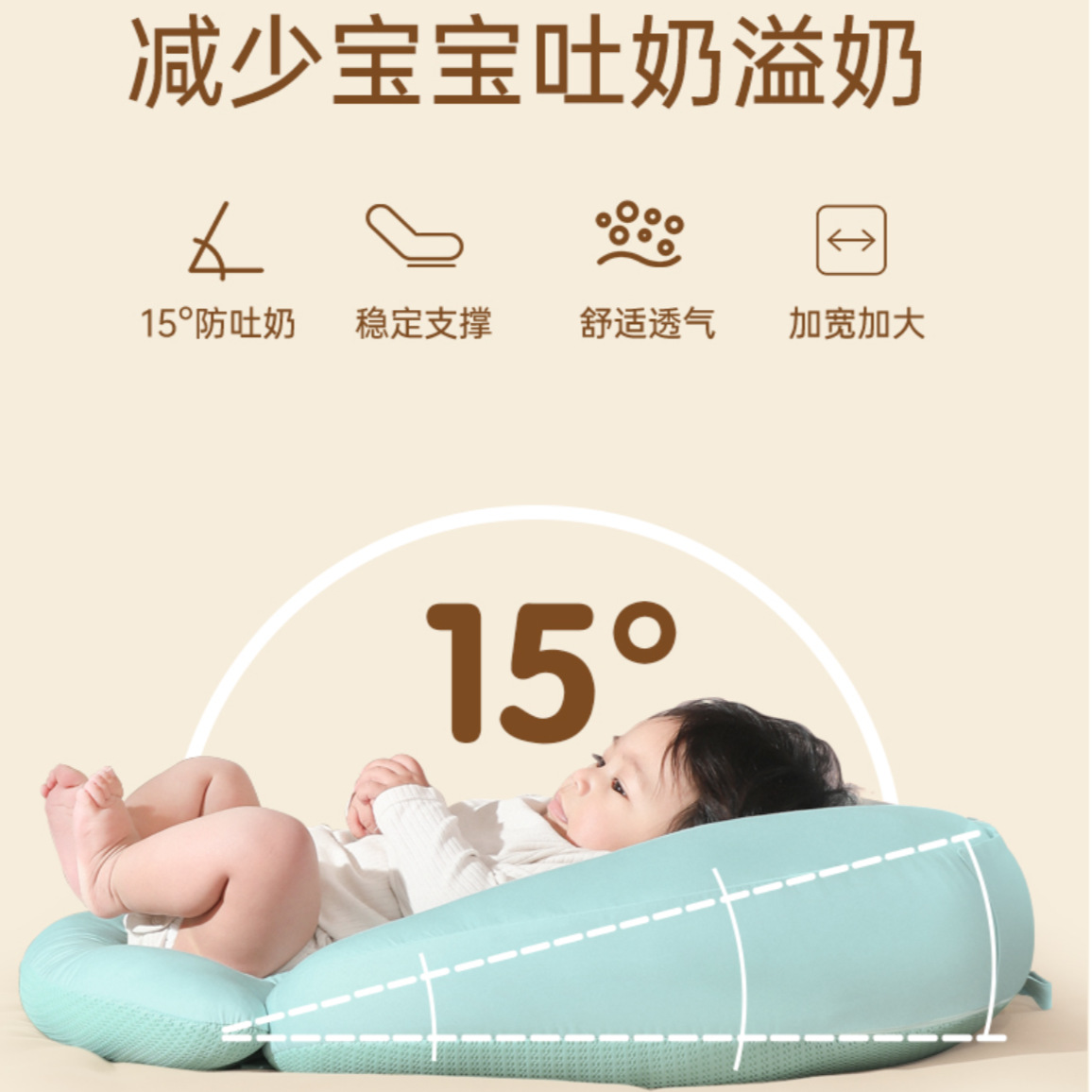 15度の傾斜角度設計により吐き戻しを防止し、安定した姿勢で授乳ができます。