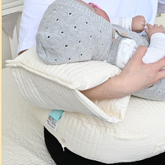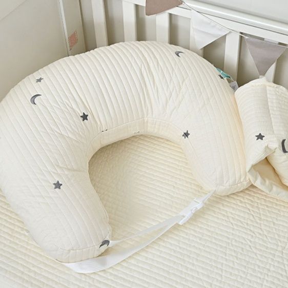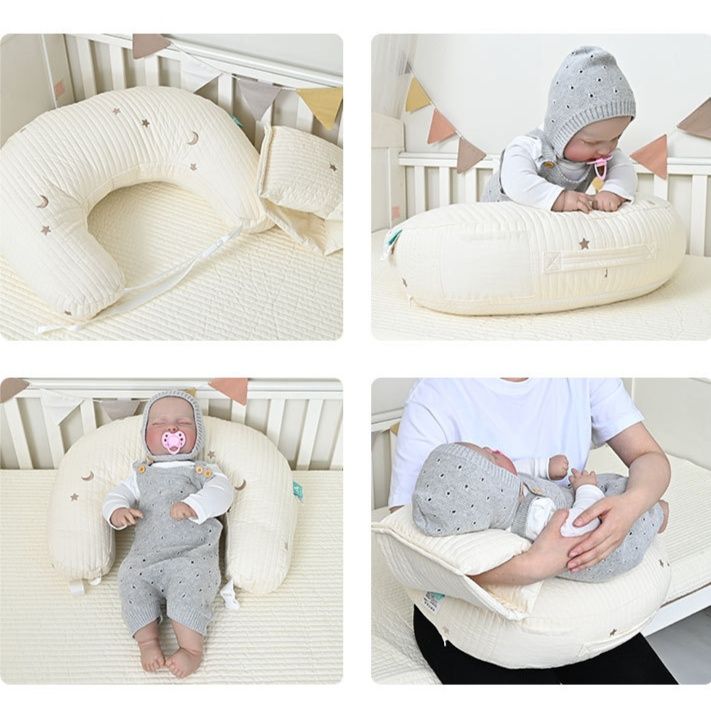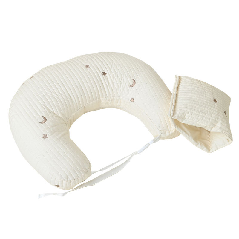 三日月型の立体設計で授乳時の姿勢を安定させ、ママの腕や腰への負担を軽減します。