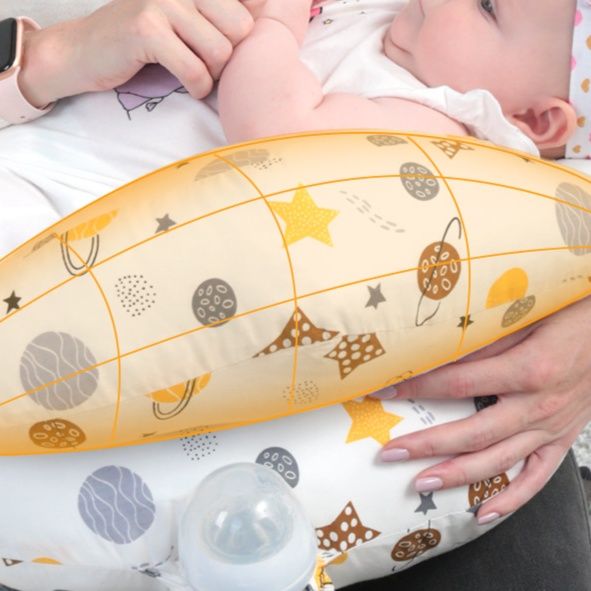 体にフィットする三日月型で赤ちゃんを優しく支え、授乳時の負担を軽減します。